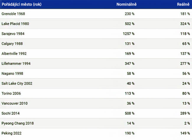 Tabulka ukazuje, o kolik pořadatelé překročily plánované náklady na pořádání her, v procentech.