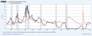 GRAF: Srovnání vývoje efektivní sazby federálních fondů a míry nezaměstnanosti