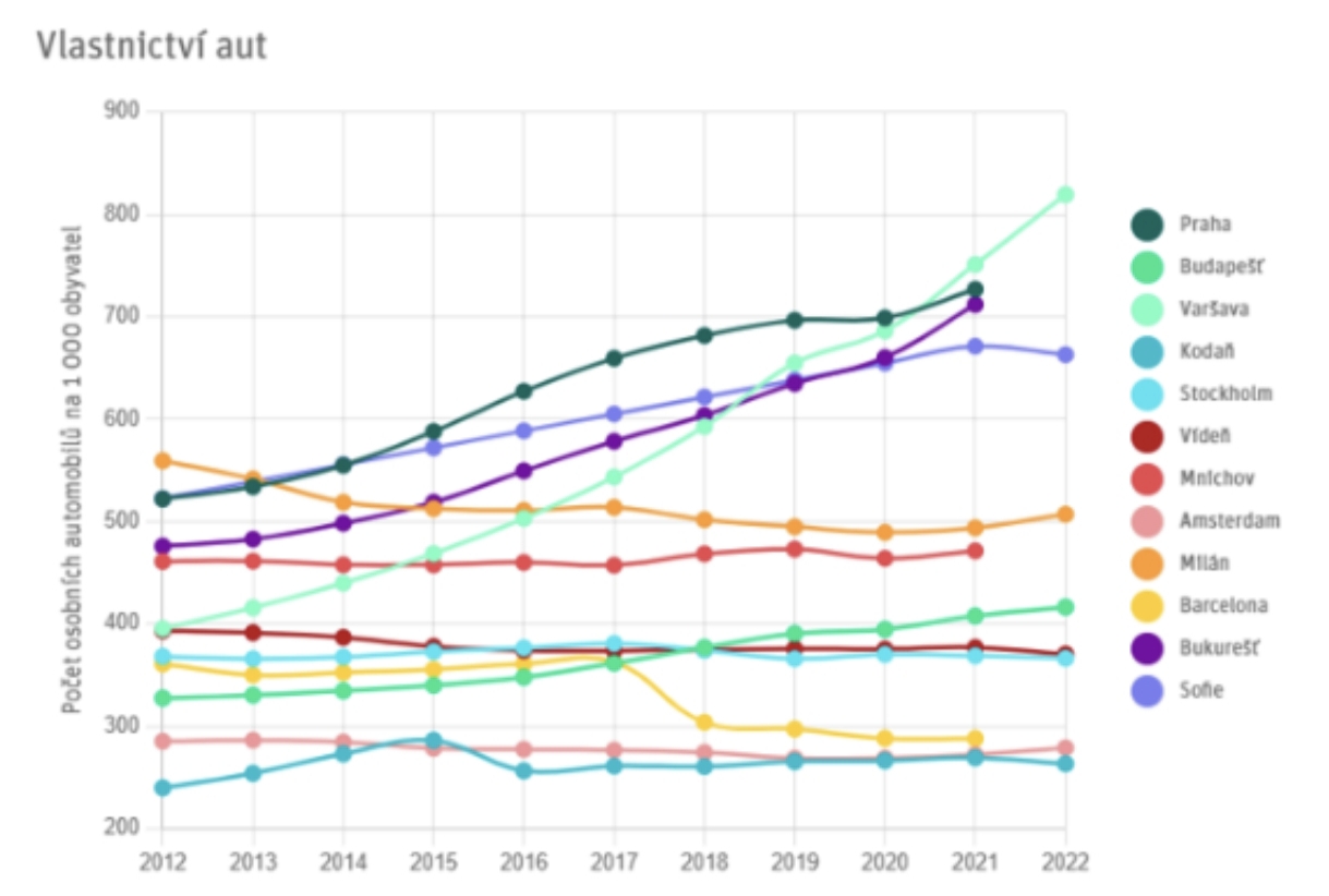Graf níže z dílny IPR Praha zachycuje trend uplynulých let, kdy v městech zemí střední a východní Evropy – tedy v zemích bývalého východního bloku – přibývá aut v přepočtu na obyvatele tak výrazně, že už zřetelně předčí západní města, která druhdy dominovala.