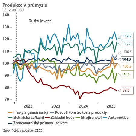 V posledních měsících ho táhne vpřed zejména výroba kovových konstrukcí, producenti plastů a gumárenský průmysl. Tato odvětví jsou více či méně napojena na automotive, který aktuálně sice stagnuje. Podle sektorových průzkumů ale vykazuje vysoké využití výrobních kapacit (blízko 100 %). To mimochodem ostře kontrastuje se situací v západní Evropě.