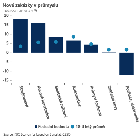 Setrvale také velmi slabý zůstává výkon producentů elektroniky a počítačového vybavení. Značně nevyrovnaný je i vývoj v dalším páteřním odvětví – ve strojírenství. Tam však alespoň vidíme v posledních měsících vylepšení v oblasti nových objednávek.