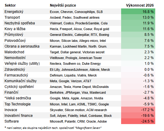 Investoři jsou nyní výrazně selektivnější a upřednostňují energetiku, průmysl, dopravu, základní spotřebu, těžbu kovů a obranný sektor. Tedy oblasti těžící z reálné ekonomické aktivity, ochrany proti inflaci a vládních či infrastrukturních výdajů.