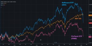 Jedná se o sektory softwarových služeb (modrá křivka) a finančních technologií (růžová křivka). Zatímco index S&P 500 klesl od začátku roku o necelé jedno procento, tyto sektory poklesly o -24,5 procenta (software) a -19,6 procenta (fintech). Zároveň je patrné, jak prudké jsou tyto poklesy ve srovnání s vývojem indexu a historickým vývojem.